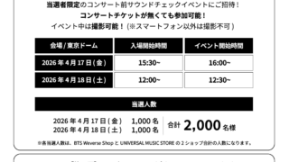 BTSの新アルバム「アリラン」購入で抽選の東京ドームサウンドチェックイベントがあります!BTS Weverse ShopとUNIVERSAL MUSIC STOREの各ストアで下記期間中に応募対象商品を予約、購入した人の中から抽選で招待され...